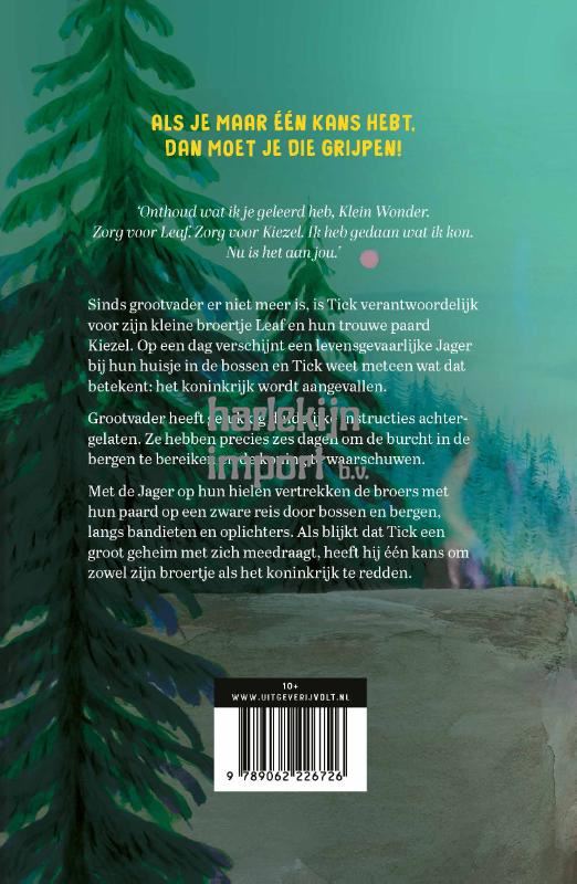 Als je maar één kans hebt, dan moet je die grijpen‘Denk aan wat ik je heb geleerd, Klein Wonder. Zorg voor Leaf, zorg voor Kiezel. Ik heb gedaan wat ik kon. Nu is het aan jou…’Sinds Grootvader er niet meer is, is Tick verantwoordelijk voor zijn kleine broertje Leaf en hun trouwe paard Kiezel. Op een dag verschijnt een dodelijke Jager bij hun huisje in de bossen en Tick weet meteen wat dat betekent: het koninkrijk wordt aangevallen. Grootvader heeft gelukkig duidelijke instructies achtergelaten. Ze hebben precies zes dagen om de burcht in de bergen te bereiken en de koning te waarschuwen. Met de jager op hun hielen vertrekken de broers en hun paard op een zware reis door bossen en bergen, langs bandieten en oplichters. Als blijkt dat hij een groot geheim met zich meedraagt, heeft Tick één kans om zowel zijn broertje als het koninkrijk te redden.