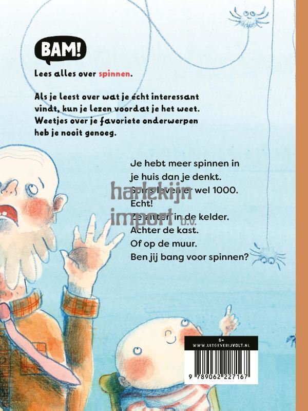 Als je leest over wat je écht interessant vindt, kun je lezen voordat je het weet. Weetjes over je favoriete onderwerpen heb je nooit genoeg. Bam! Lees alles over spinnen.Je hebt meer spinnen in je huis dan je denkt.Soms leven er wel 1000.Echt!Ze zitten in de kelder.Achter de kast.Of op de muur.Ben jij bang voor spinnen?‘Nieuwsgierige kinderen kunnen hun hart ophalen aan deze toffe serie. Een aanrader voor kinderen die ongeveer één jaar leesonderwijs hebben gehad.’ – Kinderboekenjournaal‘Kinderen [worden] uitgedaagd om soms een stapje te doen over de grenzen van hun kunnen.’ – Libris Kinderboek van de maand‘De informatieve teksten zijn speels, grappig en vrolijk. De taal is rijk en uitdagend.’ – Boekwijzer ‘Een waardevolle toevoeging aan de steeds mooiere verzameling aan lerenlezenboeken die de laatste tijd verschijnen. Ik heb nu al zin in de andere delen!’ – Lang leve lezen‘Hier word ik zo blij van! Alweer zo’n toffe serie die niet zo strak vast houdt aan het AVI niveau!’ – Leesadvies ‘Soms ontdek je nieuwe boeken waarbij je meteen denkt: waarom heeft iemand zoiets niet eerder gemaakt?’ – Reformatorisch Dagblad