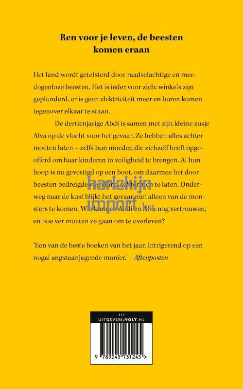 De wereld wordt geteisterd door raadselachtige en meedogenloze beesten. Het is ieder voor zich: winkels zijn geplunderd, er is geen elektriciteit meer en buren komen tegenover elkaar te staan.De dertienjarige Abdi is samen met zijn kleine zusje Alva op de vlucht voor het gevaar. Ze hebben alles achter moeten laten β zelfs hun moeder, die zichzelf heeft opgeofferd om haar kinderen in veiligheid te brengen. Hun laatste hoop is dat ze door het bos bij een haven kunnen komen, om het door beesten bedreigde vasteland achter zich te laten. Onderweg blijkt het gevaar niet alleen van de monsters te komen. Wie kunnen Abdi en Alva nog vertrouwen, en hoe ver moeten ze gaan om te overleven?Beesten is een meeslepend en filmisch verhaal dat de paniek van vluchten op bloedstollende wijze invoelbaar maakt voor jonge lezers.βEen van de beste boeken van 2023. Beesten doet denken aan de klassieker De weg van Cormac McCarthy. Intrigerend op een nogal angstaanjagende manier.β β Aftenposten, het grootste Noorse dagblad
