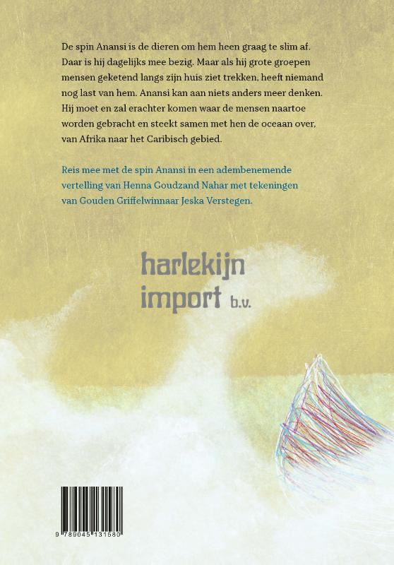 Reis mee met de spin Anansi in een adembenemende vertelling De spin Anansi is de dieren om hem heen graag te slim af. Daar is hij dagelijks mee bezig. Maar als hij grote groepen mensen geketend langs zijn huis ziet trekken, heeft niemand nog last van hem. De andere dieren kijken weg, maar Anansi kan aan niets anders meer denken. Hij moet en zal erachter komen waar de mensen naartoe worden gebracht en steekt samen met hen de oceaan over, van Afrika naar het Caribisch gebied.