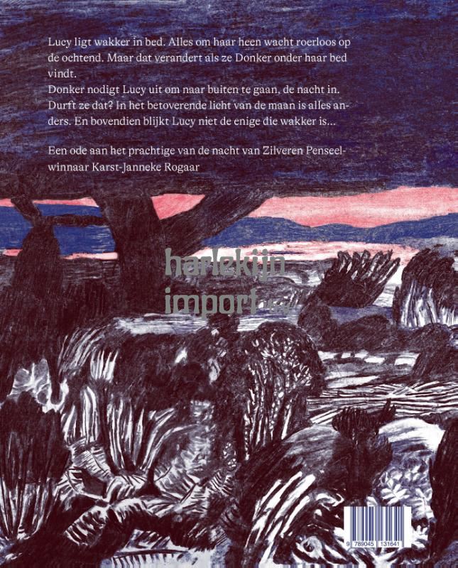 Een ode aan het prachtige van de nacht Het is midden in de nacht en Lucy is wakker. De hele kamer wacht roerloos tot de dag weer begint. Was het maar ochtend! Als Lucy het licht aan doet hoort ze een stem onder haar bed. ‘Ik ben het, Donker,’ zegt de stem. Maar als ze onder haar bed durft te kijken ziet ze… helemaal niets. Karst-Janneke Rogaar schreef en tekende een bijzonder sfeervol prentenboek over een meisje dat eropuit trekt in het donker. ’s Nachts, met alleen het betoverende licht van de maan, is de wereld vol met nieuwe geuren en geluiden. En bovendien blijkt Lucy niet de enige die wakker is…