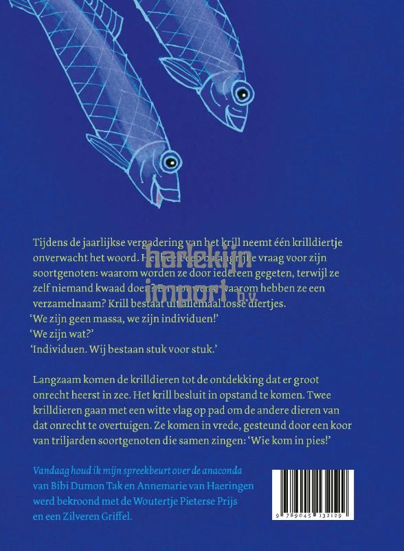 Tijdens de jaarlijkse vergadering van het krill neemt één krilldiertje onverwacht het woord. Het heeft een belangrijke vraag voor zijn soortgenoten. Waarom worden ze door iedereen gegeten, terwijl ze zelf niemand kwaad doen? En trouwens, waarom hebben ze een verzamelnaam? Krill bestaat uit allemaal losse diertjes. ‘We zijn geen massa, maar we zijn individuen!’ ‘We zijn wat?’ ‘Individuen. Aparte dieren. Wij bestaan stuk voor stuk.’ Langzaam komen de krilldieren tot de ontdekking dat er groot onrecht heerst in zee. Het krill besluit in opstand te komen. Twee krilldieren gaan met een witte vlag op pad om de andere dieren van het onrecht te overtuigen. Ze komen in vrede, gesteund door een koor van triljarden soortgenoten die samen zingen: ‘Wie kom in pies!’ Vandaag houd ik mijn spreekbeurt over de anaconda is het vorige boek dat Bibi Dumon Tak en Annemarie van Haeringen samen maakten. Het werd bekroond met de Woutertje Pieterse Prijs en een Zilveren Griffel. Ook daarin krijgen dieren zelf het woord. En hoe!