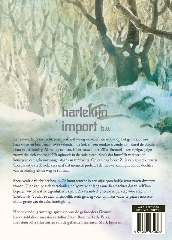 Ze is vriendelijk en zacht, maar ook wat wazig en nai¨ef. Ze woont op het grote slot van haar vader en heeft maar twee vrienden: de kok en een rondzwervende kat, Karel de Stoute. Haar vader, koning Alfred de achtste, is hertrouwd met Zilla Tarantel – een rijzige, ijzige vrouw die zich voornamelijk ophoudt in de rode toren. Sinds dat huwelijk verkeert de koning in een geheimzinnige staat van verdoving. Op een dag hoort Zilla een gesprek tussen Sneeuwwitje en de kok; en vanaf dat moment probeert de nieuwe koningin om de dochter van de koning uit de weg te ruimen. Sneeuwwitje vlucht het bos in. Ze komt terecht in een afgelegen huisje waar zeven dwergen wonen. Hier kan ze zich verschuilen en komt ze er langzamerhand achter dat ze ze´lf kan bepalen wie of wat ze eigenlijk wil zijn... Zo verandert Sneeuwwitje, stap voor stap, in Sneeuwwit. Totdat ze zich uiteindelijk sterk genoeg voelt om haar vader te gaan verlossen uit de greep van de valse koningin... Het bekende, grimmige sprookje van de gebroeders Grimm herverteld door meesterverteller Daan Remmerts de Vries, met sfeervolle illustraties van de geliefde illustrator Mark Janssen.
