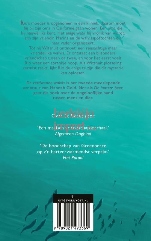 Rio’s moeder is opgenomen in een kliniek, daarom moet hij bij zijn oma in Californië gaan wonen. Een oma die hij nauwelijks kent. Het enige waar hij vrolijk van wordt, zijn zijn vriendin Marina en de walvisspottochten die haar vader organiseert. Tot hij Witsnuit ontmoet: een reusachtige maar vriendelijke walvis. Er ontstaat een bijzondere vriendschap tussen de twee, en voor het eerst voelt Rio weer een sprankje hoop. Als Witsnuit plotseling vermist raakt, lijkt Rio de enige te zijn die dit mysterie op kan lossen. De verdwenen walvis is het tweede meeslepende avontuur van Hannah Gold. Net als haar debuut, De laatste beer, gaat dit verhaal over de ongelooflijke band tussen mens en dier. Over De laatste beer: 'De boodschap van Greenpeace op z’n hartverwarmendst verpakt.’ – Joukje Akveld in Het Parool ‘Een magisch vriendschapsverhaal.’ – Het Algemeen Dagblad ‘Onweerstaanbaar.’ – The Times