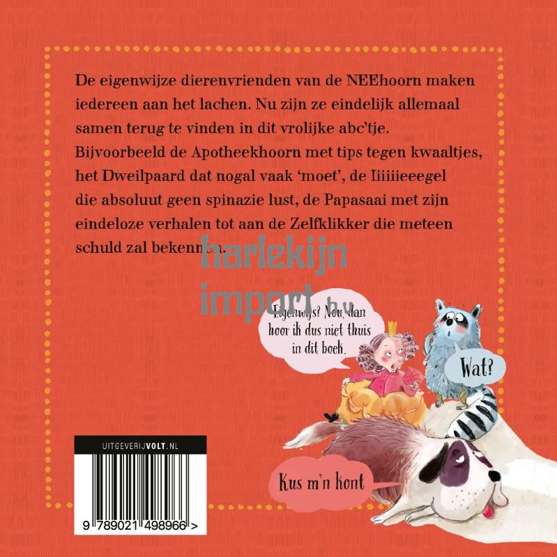 De eigenwijze dierenvrienden van de NEEhoorn maken iedereen aan het lachen. Nu zijn ze eindelijk allemaal samen terug te vinden in dit vrolijke abc’tje. Bijvoorbeeld de Apotheekhoorn met tips tegen kwaaltjes, het Dweilpaard dat nogal vaak ‘moet’, de Iiiiiieeegel die absoluut geen spinazie lust, de Papasaai met zijn eindeloze verhalen tot aan de Zelfklikker die meteen schuld zal bekennen.