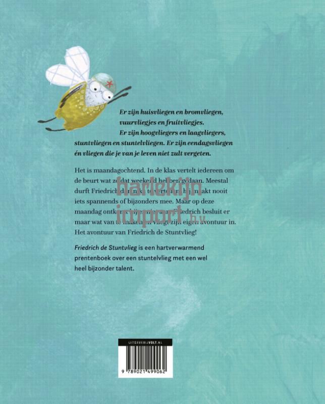 Ontroerend prentenboek over een show-stelende stuntelvlieg Het is maandagochtend en in de klas vertelt iedereen om de beurt wat ze dat weekend hebben gedaan. Meestal durft Friedrich dan niks te vertellen, hij maakt nooit iets spannends of bijzonders mee. Maar op deze maandag ontkomt hij er niet aan. Friedrich besluit er maar wat van te maken en vliegt zijn eigen avontuur in. Het avontuur van Friedrich de Stuntvlieg! Eenmaal onderweg lijkt Friedrich zijn reputatie niet bepaald waar te kunnen maken. Wie zit er te wachten op een stuntvlieg met hoogtevrees? Eentje met een zwakke maag, eentje die het niet alleen kan… Maar wat blijkt, Friedrich heeft zo zijn eigen talent! Friedrich de Stuntvlieg is een hartverwarmend boek waarin iedereen in het licht mag staan. Want iedereen is bijzonder op z’n eigen manier.