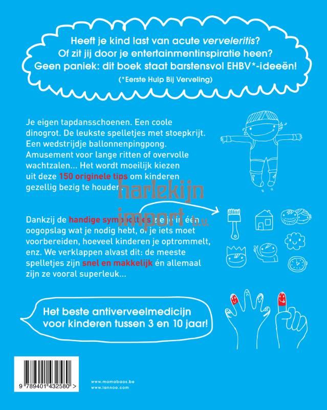 Het is afgelopen met zeurende kinderen! Hier vind je een topverzameling korte en eenvoudige, maar vooral superleuke speel- en knutselideetjes. Van lieveheersbeestjes op je nagels schilderen en een hogehakkenloop met gekke hoedjes op, tot halloweenpetanque en een wedstrijdje apennootjesslingeren. Elk idee krijgt duidelijke pictogrammen mee: voor welke leeftijd, voor binnen of buiten, voor jongens/meisjes, voor hoeveel spelers, heb je materiaal nodig, heb je mama/papa nodig, in welk seizoen speel je dit, enz...