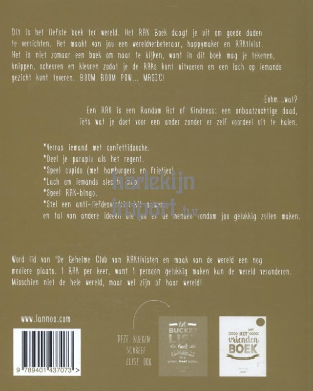 Een cool teken-, knip- en plakboek met leuke opdrachten Een 'random act of kindness' is een onbaatzuchtige daad. Je doet iets voor een ander zonder er zelf voordeel uit te halen. Gewoon, omdat het leuk is. Kom achter je computerscherm vandaan en laat je liefste zelf zien. Geef gratis complimentjes weg. Was niet alleen jouw auto, maar ook die van je buren. Geef iemand een medaille, gewoon omdat hij of zij het verdient. Doe eens boodschappen voor die oudere vrouw in je straat. Of verras je vriendin door een avondje op te passen op de kinderen zodat zij eens met manlief uit eten kan (of eens kan doorslapen). Maak de wereld een betere plek, een #RAK per keer!