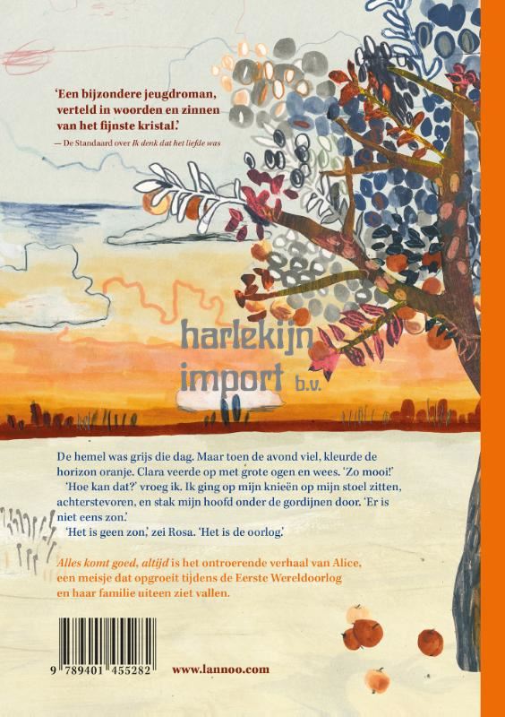 De hemel was grijs die dag. Maar toen de avond viel, kleurde de horizon oranje. Clara veerde op met grote ogen en wees. 'Zo mooi!' 'Hoe kan dat?' vroeg ik. Ik ging op mijn knieën op mijn stoel zitten, achterstevoren, en stak mijn hoofd onder de gordijnen door. 'Er is niet eens zon.' Er kwam geen antwoord. Ik keek achterom. Oscar stond stil met zijn handen in zijn broekzakken. Een dun sliertje sigaret plakte tegen zijn onderlip. Hij zweeg. Mijn moeder hield haar hand voor haar mond. Mijn vader fronste diep en trok Clara op schoot. 'Het is geen zon,' zei Rosa. 'Het is de oorlog.' Alles komt goed, altijd is het ontroerende verhaal van Alice, een meisje dat opgroeit tijdens de Eerste Wereldoorlog en dat haar familie uiteen ziet vallen.