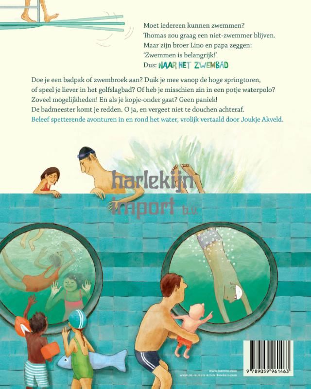 Moet iedereen kunnen zwemmen? Thomas zou graag een niet-zwemmer blijven. Maar zijn broer Lino en papa zeggen: 'Zwemmen is belangrijk!' Dus: NAAR HET ZWEMBAD Doe je een badpak of zwembroek aan? Duik je mee vanop de hoge springtoren, of speel je liever in het golfslagbad? Of heb je misschien zin in een potje waterpolo? Zoveel mogelijkheden! En als je kopje-onder gaat? Geen paniek! De badmeester komt je redden. O ja, en vergeet niet te douchen achteraf. Beleef spetterende avonturen in en rond het water, vrolijk vertaald door Joukje Akveld.