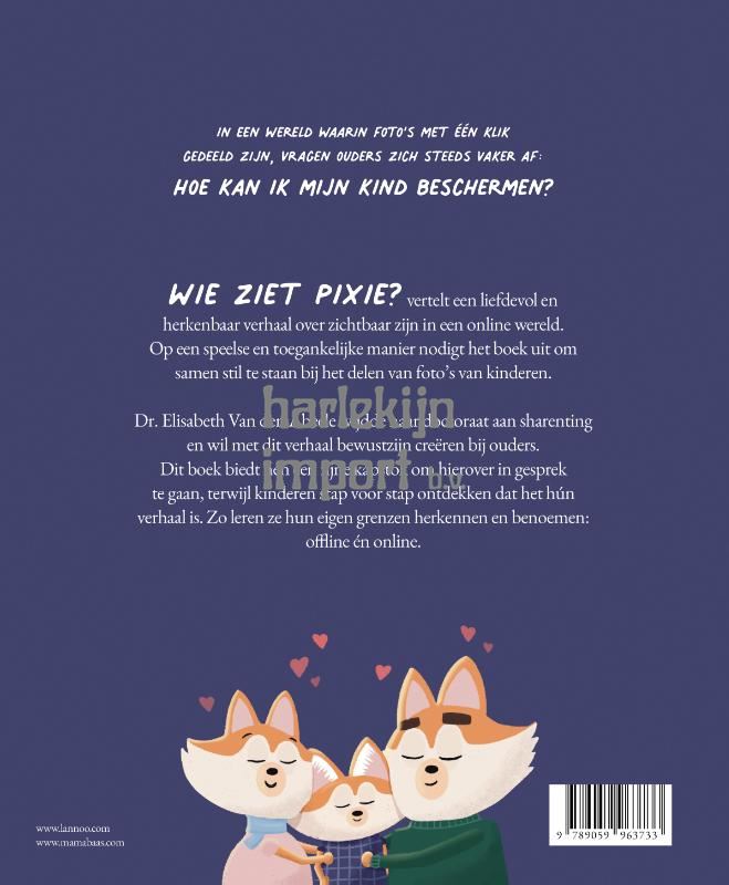 In een wereld waarin foto's met één klik gedeeld zijn, vragen ouders zich steeds vaker af: Hoe kan ik mijn kind beschermen? Wie ziet Pixie? vertelt een liefdevol en herkenbaar verhaal over zichtbaar zijn in een online wereld. Op een speelse en toegankelijke manier nodigt het boek uit om samen stil te staan bij het delen van foto's van kinderen. Dr. Elisabeth Van den Abeele wijdde haar doctoraat aan sharenting en wil met dit verhaal bewustzijn creëren bij ouders. Dit boek biedt hen een fijne kapstok om hierover in gesprek te gaan, terwijl kinderen stap voor stap ontdekken dat het hún verhaal is. Zo leren ze hun eigen grenzen herkennen en benoemen: offline én online.