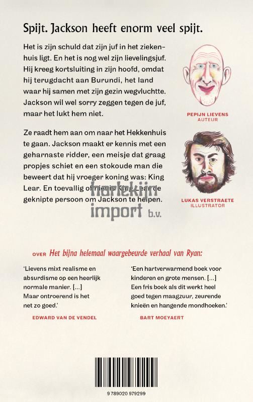 Spijt. Jackson heeft enorm veel spijt. Het is zijn schuld dat zijn juf in het ziekenhuis ligt. En het is nog wel zijn lievelingsjuf. Hij kreeg kortsluiting in zijn hoofd, omdat hij terugdacht aan Burundi, het land waar hij samen met zijn gezin wegvluchtte. Jackson wil wel sorry zeggen tegen de juf, maar het lukt hem niet. Waarom toch niet? Ze raadt hem aan om naar het Hekkenhuis te gaan. Een griezelig huis waar heel bijzondere mensen wonen. Jackson maakt er kennis met een geharnaste ridder, een meisje dat graag propjes schiet, een mensboom die uitvinder is en een stokoude man die beweert dat hij vroeger koning was: King Lear. En toevallig of niet is King Lear de geknipte persoon om Jackson te helpen.