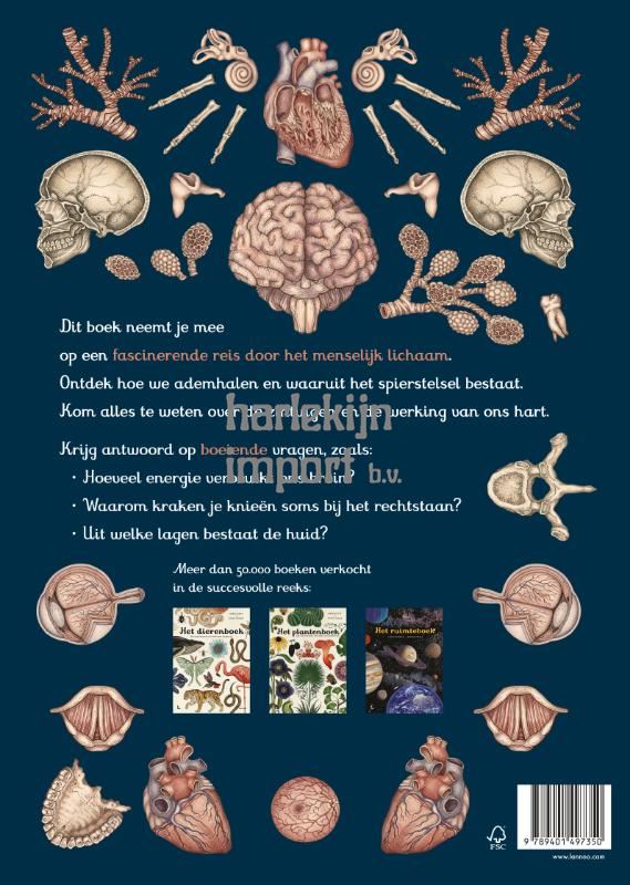 Dit boek neemt je mee op een fascinerende reis door het menselijk lichaam. Ontdek hoe we ademhalen en waaruit het spierstelsel bestaat. Kom alles te weten over de zintuigen en de werking van ons hart. Krijg antwoord op boeiende vragen, zoals: Hoeveel energie verbruikt ons brein? Waarom kraken je knieën soms bij het rechtstaan? Uit welke lagen bestaat de huid? Meer dan 50.000 boeken verkocht in de succesvolle reeks van Het dierenboek en Het plantenboek/em>.