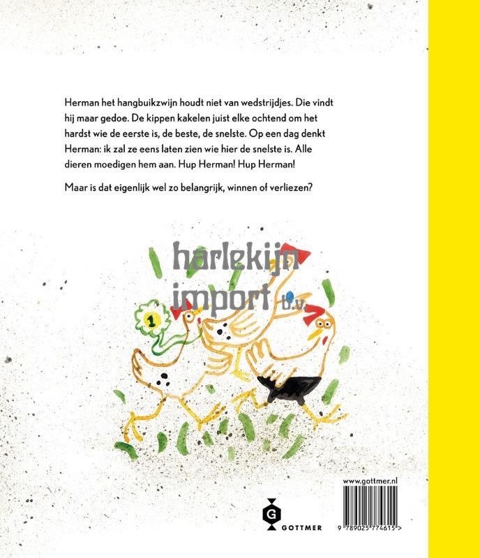 Herman het hangbuikzwijntje vindt wedstrijdjes maar gedoe. Nergens voor nodig, al die drukte. Winnen vindt hij niet belangrijk. De kippen zijn juist elke ochtend in rep en roer en kakelen druk over wie het eerste op was, wie de snelste is en wie de beste is. Op een dag is Herman het zat: hij zal ze wel eens even laten zien wie er hier de snelste is. Alle dieren moedigen hem aan. Maar is winnen eigenlijk wel zo belangrijk? Hup, Herman! Al vijftien jaar illustreert Yvonne Jagtenberg met veel liefde prentenboeken, en nu werkt ze aan haar zelfgeschreven prentenboeken. Voor het grappige en hartverwarmende ‘Hup, Herman!’ mocht ze een Gouden Penseel in ontvangst nemen!