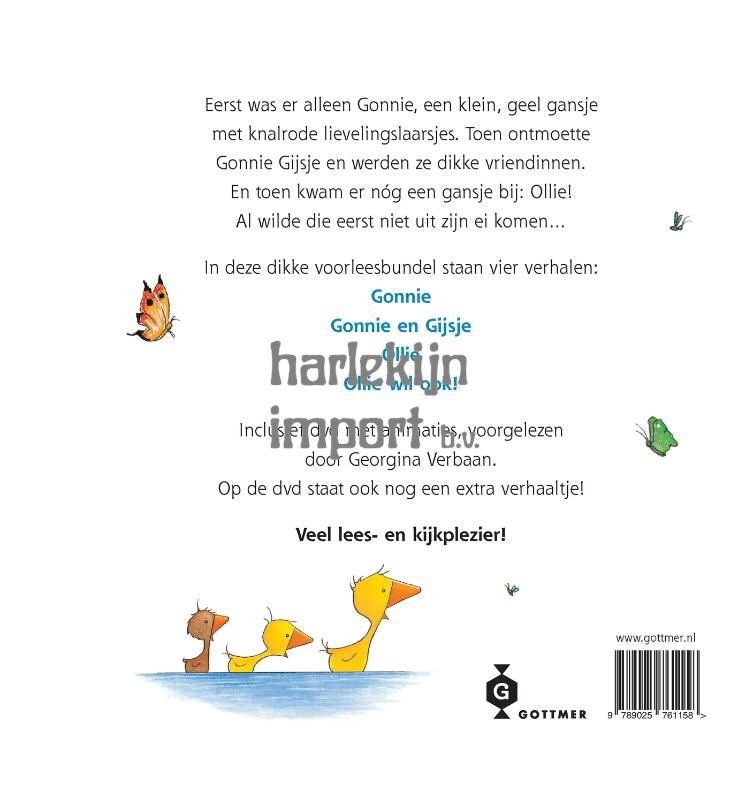 De eerste vier deeltjes van de populaire Gonnie-serie, waarin Gonnie kennismaakt met Gijsje en Ollie, zijn nu samengebracht in één groot prentenboek met een bijzonder omslag: als je het schuifje indrukt, springt Ollie uit zijn ei! Op de bijgeleverde dvd staan geanimeerde verhaaltjes die worden voorgelezen door Georgina Verbaan.