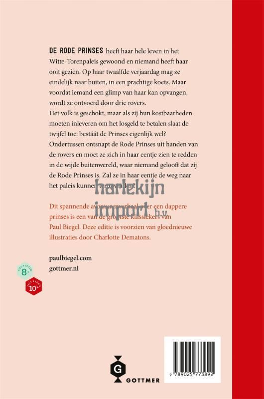 De geliefde Biegel-klassieker 'De Rode Prinses' is eindelijk weer beschikbaar en prachtig opnieuw geïllustreerd door Charlotte Dematons. Het verhaal neemt je mee naar het Witte-Torenpaleis waar de Rode Prinses haar hele leven heeft doorgebracht zonder ooit gezien te worden. Maar op haar twaalfde verjaardag is het eindelijk zover: ze mag naar buiten in een prachtige koets. De feestelijke dag wordt al snel verstoord wanneer ze wordt ontvoerd door drie rovers. Het volk is geschokt, maar al snel rijzen er twijfels. Bestaat de Rode Prinses wel echt of is het allemaal een spel? Kan ieder meisje met rood haar zich zomaar voordoen als de Prinses? Ondertussen weet de échte Rode Prinses te ontsnappen uit de handen van de rovers. Nu moet ze zichzelf zien te redden in een meedogenloze wereld buiten het paleis. Voorlezen vanaf 8 jaar, zelf lezen vanaf 10 jaar. Paul Biegel en Charlotte Dematons, die eerder ook 'Groot Biegel sprookjesboek' illustreerde, vormen een duo dat wel voor elkaar gemaakt lijkt. 'De Rode Prinses' is bekroond met een Zilveren Griffel.