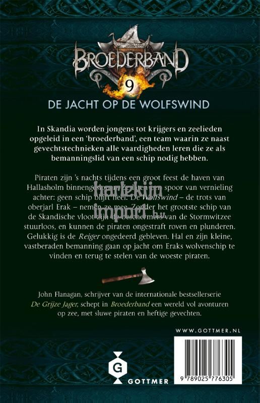 De avonturen van de bemanning van de 'Reiger' gaan verder in het negende deel in John Flanagans beroemde 'Broederband'-serie, 'De jacht op de Wolfswind'. John Flanagan, bekend van 'De Grijze Jager', houdt de spanning hoog in deel 9 van de 'Broederband'-serie met een woest zee-avontuur vol piraten, zeeslagen en avontuur.