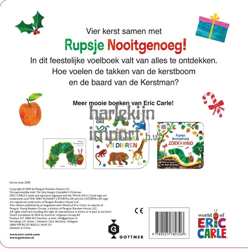 Is het een kerstboek om mee te spelen of speelgoed om te lezen? Dit kartonnen voelboek met flapjes is het allebei! Vier de kerstdagen met Rupsje Nooitgenoeg en voel de ruwe takken van de kerstboom, streel de zachte jas van de Kerstman en raad wat er in de glimmende cadeautjes zit. In dit speciale kartonboekje voel je op elke pagina verrassende texturen, ideaal voor de sensorische ontwikkeling van jonge kinderen. Rupsje Nooitgenoeg maakt de eerste feestdagen van de kleintjes nog specialer! Dankzij het prachtige en stevige voelboek 'Rupsje Nooitgenoeg - Het is kerst!' kunnen peuters vanaf 18 maanden al kennismaken met de kleurrijke, winterse wereld van Eric Carle. Rupsje Nooitgenoeg is het bekendste en meest geliefde karakter van schrijver en tekenaar Eric Carle. Hoewel het gelijknamige, iconische prentenboek al meer dan 50 jaar geleden verscheen, staat de klassieker nog altijd bij veel mensen in de boekenkast. En dat is niet verwonderlijk: de heldere collage-illustraties zijn samen met het vrolijke verhaal nog steeds een feest om te (her)lezen.