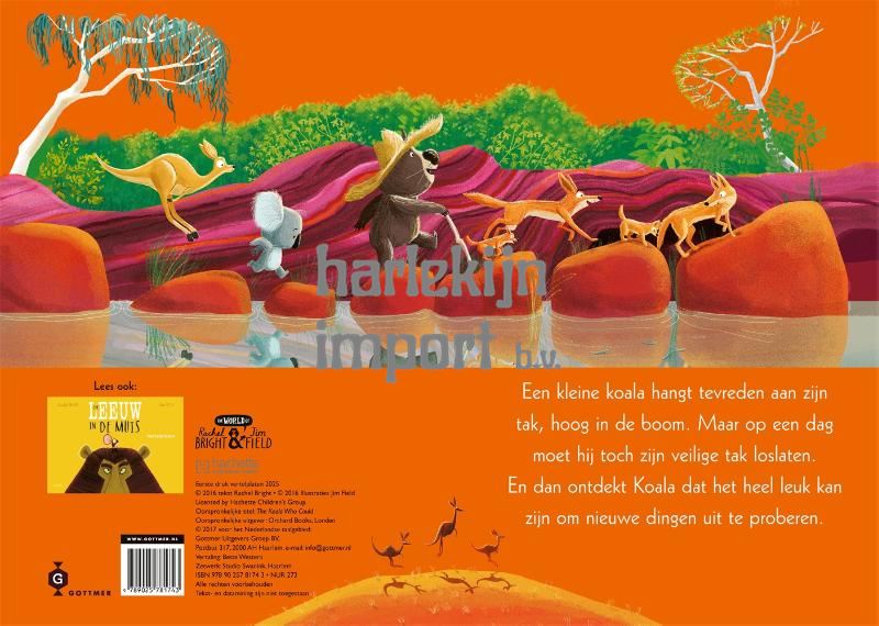 Deze grote vertelplaten van 'Laat maar los, Koala' zijn perfect om voor te lezen op de crèche, kinderdagverblijven, peuterspeelzalen en in de klas op basisscholen. 'Laat maar los, Koala', van Rachel Bright en Jim Field, is inmiddels een echte prentenboek-klassieker te noemen. Een heerlijk feelgood-verhaal met een luchtige boodschap centraal: durf los te laten. De kleine Koala is een gewoontedier. Hij is erg gesteld op zijn plekje hoog in de boom en houdt dingen graag zoals ze zijn. Op een dag gebeurt het ergste wat Koala zich voor kan stellen: zijn boom valt om. Nu moet hij wel loslaten en komt hij erachter dat een verandering niet het einde van de wereld betekent. Voor kinderen vanaf 3 jaar. Schrijver Rachel Bright en illustrator Jim Field zijn het duo achter populaire prentenboeken als 'Twee vechtende eekhoorntjes', 'De walvis wilde meer' en 'Wolfje wil naar huis'. Al hun dierenverhalen zijn prachtig om te zien, heerlijk op rijm en bevatten een wijze les.