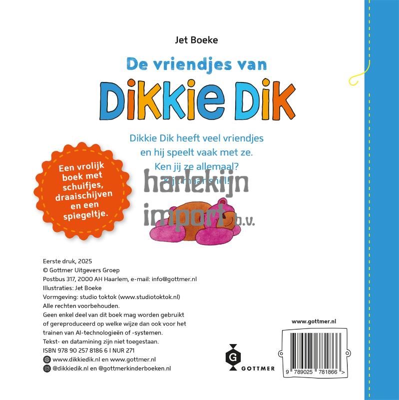<p>'De vriendjes van Dikkie Dik' is een stevig kartonboek met schuifjes, draaischijf en spiegeltje, speciaal voor de jongste fans van de beroemdste oranje kat van Nederland.<br><br>In dit interactieve Dikkie Dik-boekje leren peuters wie de beste vriendjes van Dikkie Dik zijn en wat ze samen het liefst doen. Poes Muis haalt hem elke dag op om te spelen in het bos, waar ook Eekhoorn woont. En wie ligt er thuis trouw op hem te wachten in zijn mandje? Beer, Dikkie Diks allerliefste knuffelvriend.<br><br>Kinderen kunnen zelf de vriendjes en speeltjes tevoorschijn toveren met de stevige schuifjes en het draaischijfje. Een kleurrijk peuterboek vol bewegende onderdelen, perfect voor kleine handjes. De korte, eenvoudige zinnen maken het boekje ook ideaal om voor te lezen aan kinderen vanaf 2 jaar.<br><br>'De vriendjes van Dikkie Dik' is een vrolijk, leerzaam en verrassend Dikkie Dik-kartonboek, dat spelenderwijs uitnodigt tot ontdekken, bewegen en benoemen.<br><br>Sinds 1978 verovert Dikkie Dik, ooit begonnen in Sesamstraat, al generaties lang de harten van peuters, kleuters en hun ouders. Van de boeken van Jet Boeke zijn inmiddels miljoenen exemplaren verkocht.</p>