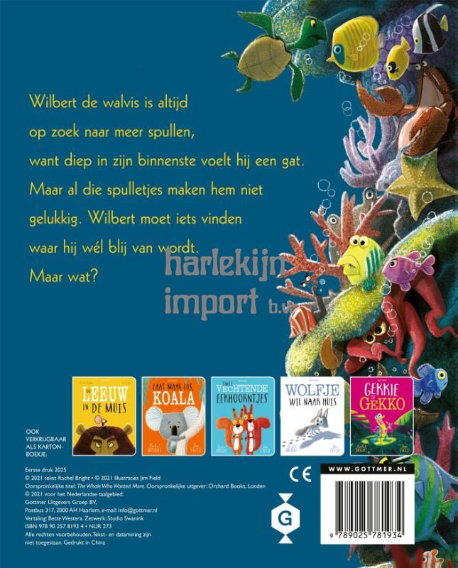 <p>Deze kartonnen editie van 'De walvis wilde meer' vertelt een prachtig onderwaterverhaal over de zoektocht naar vriendschap, voor kinderen vanaf 3 jaar.<br><br>Diep, diep in de zee woont Wilbert de walvis. Hij wordt elke ochtend wakker met een knagend gevoel in zijn buik. Het is net alsof er een groot gat zit, maar hij heeft geen honger. Dus wat mist er dan?<br><br>Om de leegte te vullen, gaat Wilbert op zoek naar spullen. De mooiste schatten uit de diepzee, bijzondere dingen uit scheepswrakken. Op een dag ziet hij een mooi koraalrif - is dat wat hij zoekt? Maar dan zet een dappere kleine krab hem aan het denken. Misschien kan de walvis het gat niet vullen met meer spullen, maar juist door iets aan een ander te geven.<br><br>Schrijver Rachel Bright en illustrator Jim Field zijn het duo achter populaire prentenboeken als 'Twee vechtende eekhoorntjes', 'Laat maar los, Koala' en 'Wolfje wil naar huis'. Al hun dierenverhalen zijn prachtig om te zien, heerlijk op rijm en bevatten een wijze les.</p>
