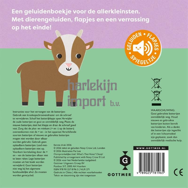 Het leukste geluidenboekje met kinderboerderijdieren voor kindjes vanaf 1 jaar! 'Wat hoor ik daar? - Tjiep!' is een innovatief en interactief flapjesboek dat perfect is voor nieuwsgierige dreumesen. In dit kartonboekje met het thema kinderboerderij hoor je vijf verschillende dierengeluiden. Luister samen naar het geluid, raad welk dier zich verstopt en til het flapje op om te zien welk boerderijdier het is! Was het een eendje, een geitje, een konijntje of een kuikentje? Als verrassing aan het einde: een geluidje en een spiegel waarin je kindje zichzelf kan zien! Pui Lee is een freelance illustrator en grafisch ontwerper uit Londen. Met een speelse en grafische benadering maakt ze gebruik van eenvoudige vormen, structuren en kleuren. Ze illustreert graag alledaagse objecten en experimenteert met texturen en patronen om een verhaal te vertellen. 'Wat hoor ik daar? - Tjiep!' is zonder twijfel het leukste dierenboekje met geluiden om spelenderwijs kennis te maken met de kinderboerderij. Geschikt voor kindjes vanaf 12 maanden. Ook verkrijgbaar in de serie Wat hoor ik daar? zijn: 'Wat hoor ik daar? - Miauw!', 'Wat hoor ik daar? - Boe!' en 'Wat hoor ik daar? - Brul!'