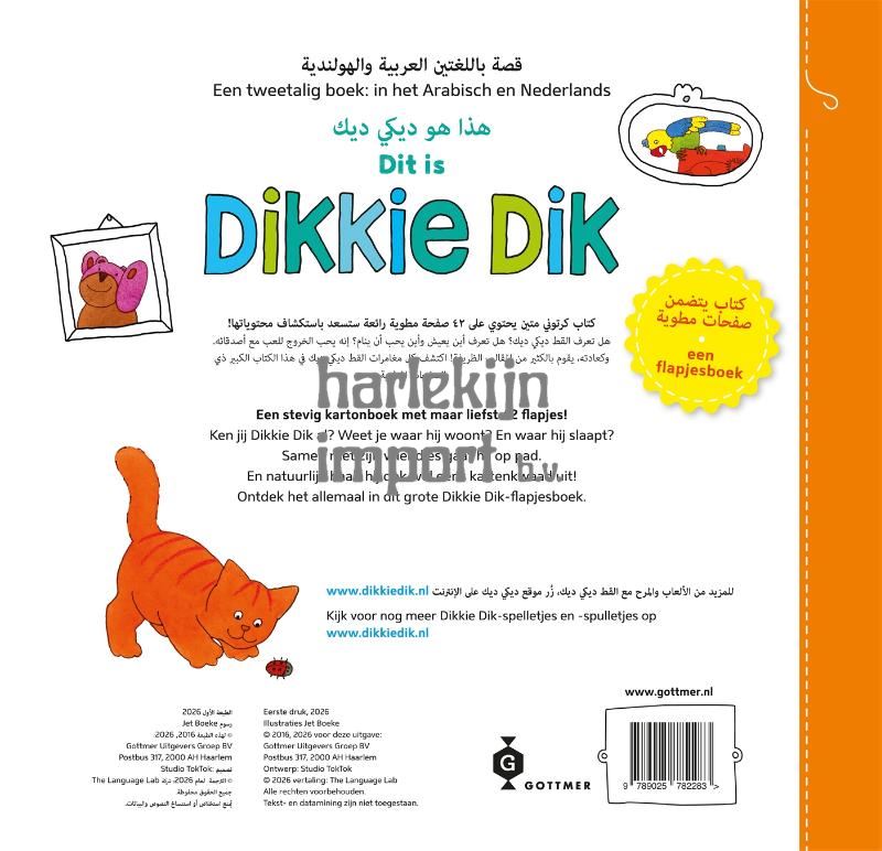 De avonturen van Dikkie Dik zijn nu beschikbaar voor een Arabischsprekend publiek dankzij het tweetalige kinderboek 'Dit is Dikkie Dik / Hatha Huwa Dikkie Dik', een mooi groot kartonboek boordevol flapjes over de liefste en ondeugendste kater. Dit tweetalige prentenboek Nederlands-Arabisch is speciaal gemaakt voor kinderen die opgroeien met meerdere talen en draagt bij aan de (voor)leesbevordering. Dit maakt het boek ideaal om te gebruiken op scholen en kinderdagverblijven, maar natuurlijk ook lekker thuis in meertalige gezinnen. De tweetalige versie van 'Dit is Dikkie Dik' biedt een speelse manier voor nieuwsgierige peuters om zowel in hun moedertaal als in het Nederlands hun woordenschat uit te breiden. Door de tweetalige aanpak wordt ruimte geboden voor en erkenning gegeven aan de eigen taal van ouders, grootouders en kinderen, wat de leesmotivatie en de ontwikkeling van leesvaardigheden bevordert. Deze boekjes zijn een uitkomst voor ouders en verzorgers die graag willen voorlezen, maar dat niet doen omdat ze het Nederlands (nog) niet voldoende beheersen. Ontdek nu de tweetalige avonturen van Dikkie Dik en vergroot spelenderwijs de taalkennis van jouw kleintje! De bijzondere tweetalige kinderboeken van Dikkie Dik, gemaakt door Jet Boeke, zijn beschikbaar in vier edities: Nederlands-Engels, Nederlands-Spaans, Nederlands-Turks en Nederlands-Arabisch. Leuk voor kinderen vanaf 2 jaar.