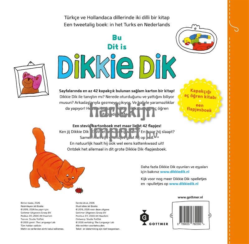 De avonturen van Dikkie Dik zijn nu beschikbaar voor een Turkssprekend publiek dankzij het tweetalige kinderboek 'Dit is Dikkie Dik / Bu Dikkie Dik’, een mooi groot kartonboek boordevol flapjes over de liefste en ondeugendste kater. Dit tweetalige prentenboek Nederlands-Turks is speciaal gemaakt voor kinderen die opgroeien met meerdere talen en draagt bij aan de (voor)leesbevordering. Dit maakt het boek ideaal om te gebruiken op scholen en kinderdagverblijven, maar natuurlijk ook lekker thuis in meertalige gezinnen. De tweetalige versie van 'Dit is Dikkie Dik' biedt een speelse manier voor nieuwsgierige peuters om zowel in hun moedertaal als in het Nederlands hun woordenschat uit te breiden. Door de tweetalige aanpak wordt ruimte geboden voor en erkenning gegeven aan de eigen taal van ouders, grootouders en kinderen, wat de leesmotivatie en de ontwikkeling van leesvaardigheden bevordert. Deze boekjes zijn een uitkomst voor ouders en verzorgers die graag willen voorlezen, maar dat niet doen omdat ze het Nederlands (nog) niet voldoende beheersen. Ontdek nu de tweetalige avonturen van Dikkie Dik en vergroot spelenderwijs de taalkennis van jouw kleintje! De bijzondere tweetalige kinderboeken van Dikkie Dik, gemaakt door Jet Boeke, zijn beschikbaar in vier edities: Nederlands-Engels, Nederlands-Spaans, Nederlands-Turks en Nederlands-Arabisch. Leuk voor kinderen vanaf 2 jaar.