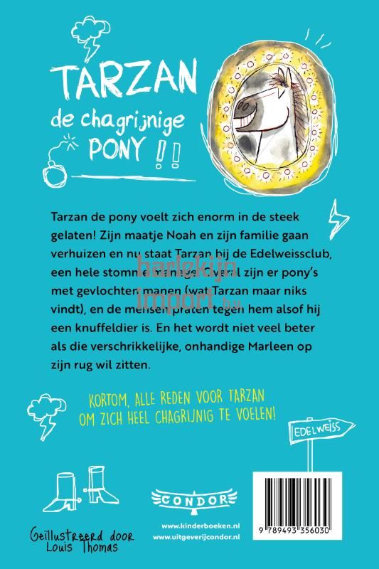 Tarzan de pony is voelt zich enorm in de steek gelaten! Zijn maatje Noah en zijn familie gaan verhuizen en nu staat Tarzan bij een kostschool. Wat een vreselijke plek… Overal zijn er pony’s met gevlochten manen (wat Tarzan maar niks vindt), en de mensen praten tegen hem alsof hij een knuffeldier is. En het wordt niet veel beter als die verschrikkelijke, onhandige Marleen op zijn rug wil zitten. Kortom, alle reden voor Tarzan om zich heel chagrijnig te voelen!