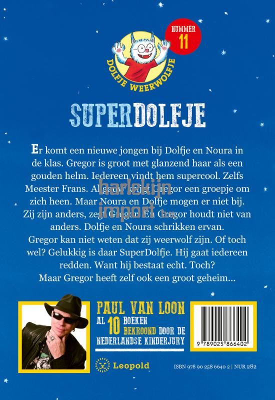 Er komt een nieuwe jongen bij Dolfje en Noura in de klas. <br> Gregor is groot met glanzend haar als een gouden helm. <br> Iedereen vindt hem supercool. Zelfs meester Frans.<br> Al gauw krijgt Gregor een groepje om zich heen. <br> Maar Noura en Dolfje mogen er niet bij. Zij zijn anders, zegt Gregor. En Gregor houdt niet van anders.<br> Dolfje en Noura schrikken ervan. <br> Gregor kan niet weten dat zij weerwolf zijn. Of toch wel? <br> Gelukkig is daar SuperDolfje. Hij gaat iedereen redden.<br> Want hij bestaat echt. Toch?<br> Maar Gregor heeft zelf ook een groot geheim...<br> <br> <br> <b>Paul van Loon: al 10 boeken bekroond door de Nederlandse Kinderjury. <br> <br> <i>SuperDolfje</i> is bekroond met een Gouden Boek van Stichting CPNB.