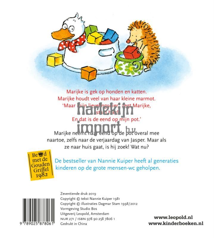Marijke is gek op honden en katten.<br> Marijke houdt veel van haar kleine marmot.<br> 'Maar mijn lievelingsdier,' zegt Marijke,<br> 'staat hier!<br> En dat is de eend op mijn pot.'<br> <br> Marijke neemt haar eend op de pot overal mee naartoe, zelfs naar de verjaardag van Jasper. Maar als ze naar huis gaat, is hij zoek! Wat nu? <br><br> <b>De bestseller van Nannie Kuiper heeft al generaties kinderen van hun angst voor de grote mensen-wc afgeholpen.<br> Bekroond met een Gouden Griffel.</b>