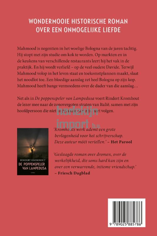 Mahmood is negentien in het woelige Bologna van de jaren tachtig. Hij stopt met zijn studie om kok te worden. Op markten en in de keukens van diverse restaurants leert hij het vak in de praktijk. En hij wordt verliefd – op de veel oudere Davide. Kan hun liefde bestaan? Terwijl Mahmood volop in het leven staat en toekomstplannen maakt, slaat het noodlot toe. Een bloedige aanslag zet heel Bologna op zijn kop. Mahmood heeft bange vermoedens over de dader van die aanslag... Net als in De poppenspeler van Lampedusa voert Rindert Kromhout de lezer mee naar de zonovergoten straten van Italië en haar bewogen geschiedenis – samen metzijn hoofdpersoon die niet anders kan dan zijn hart volgen.
