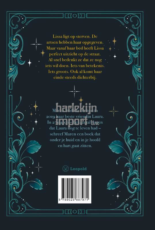 Lissa ligt op sterven. De artsen hebben haar opgegeven. Maar vanuit haar bed heeft Lissa perfect uitzicht op de straat. Al snel bedenkt ze dat ze nog iets wil doen. Iets van betekenis. Iets groots. Ook al komt haar einde steeds dichterbij. Maren Stoffels schreef in 27 dagen – het aantal dagen dat haar beste vriendin nog had nadat ze door de artsen was opgegeven – een boek dat onder je huid en in je hoofd en hart gaat zitten. Prachtige, gebonden uitgave met kleur op snee Rijk versierd binnenwerk Dubbel omslag: achter het stofomslag zit een extra omslagplaat Het artwork is gemaakt door tattoo artist Amy Kuijpers Eerste reacties van lezers op Nog 27 dagen leven ‘Een verhaal dat je nooit meer zult vergeten.’ – Bookinfluencers.com ‘Maren Stoffels laat met dit boek zien dat ze een waanzinnig geweldige schrijver is.’ – Rubén Rodriquez da Silva, Libris kinderboekenspecialist ‘Wat een ontzettend ontzettend ontzettend mooi boek.’ – Edrienne.nl – Boekenleven
