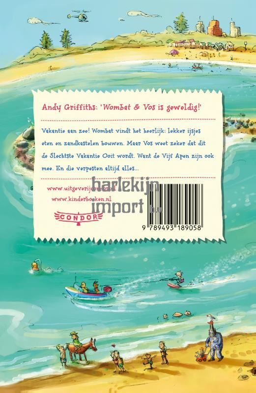 Vakantie aan zee! Wombat vindt het heerlijk: lekker ijsjes eten en zandkastelen bouwen. Maar Vos weet zeker dat dit de Slechtste Vakantie Ooit wordt. Want de vijf apen zijn ook mee. En die verpesten altijd alles…