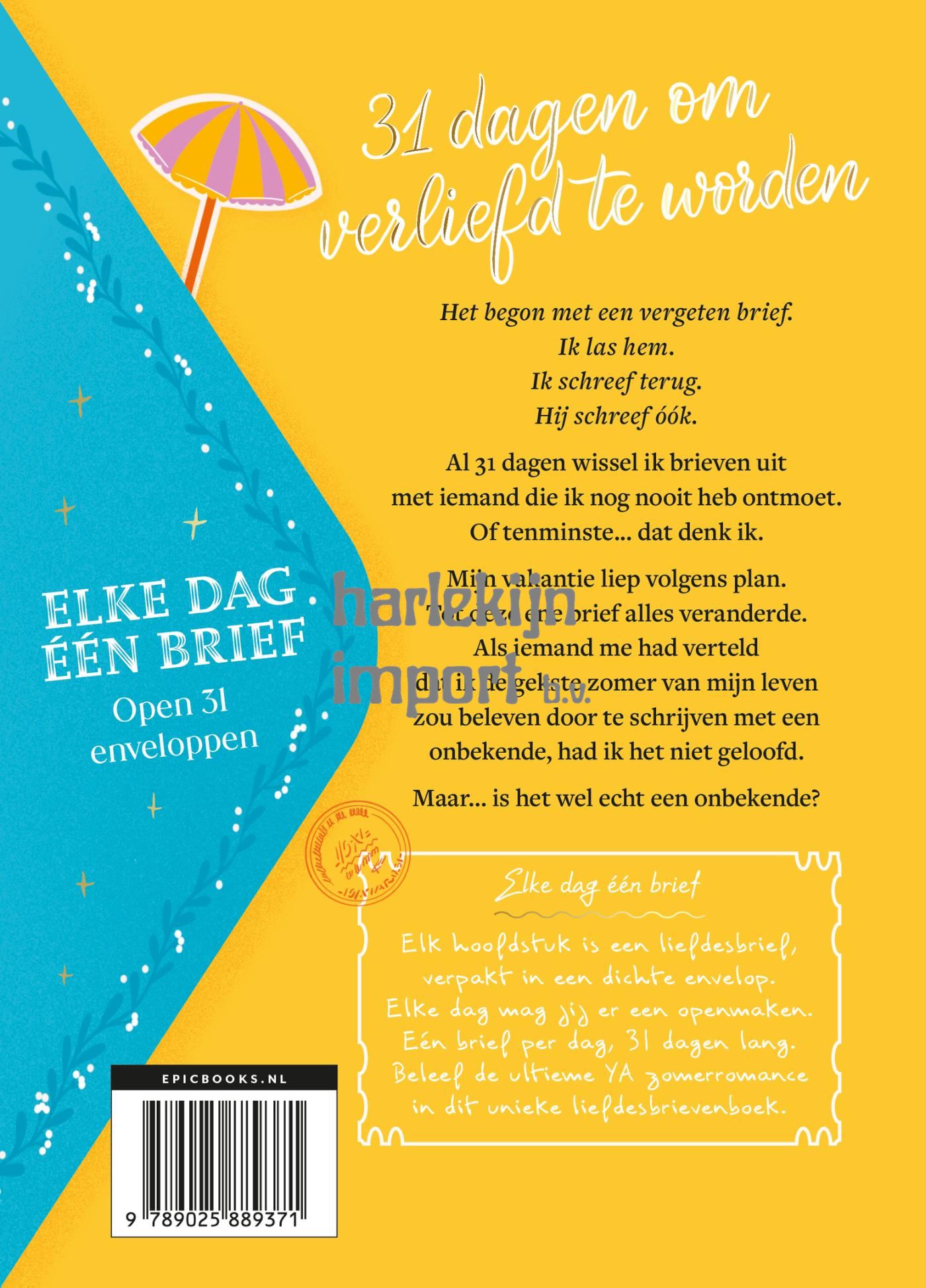 31 Days To Love You van Sophie Jomain is de ultieme YA zomerromance in de vorm van een liefdesbrievenboek. Elk hoofdstuk is een liefdesbrief, verpakt in een dichte envelop. Elke dag mag jij er een openmaken. Eén brief per dag, 31 dagen lang. Van de auteur van besteller Adventboek - A heart for Christmas. Het begon met een vergeten brief.Ik las hem.Ik schreef terug.Hij schreef óók. Mijn vakantie liep volgens plan. Tot deze ene brief alles veranderde. Als iemand me had verteld dat ik de gekste zomer van mijn leven zou beleven door 31 dagen te schrijven met een onbekende, had ik het niet geloofd. Maar... is het wel echt een onbekende? 31 dagen om verliefd te worden! 31 Days To Love You is onderdeel van de imprint Epic Books. Voor lezers vanaf 13 jaar.