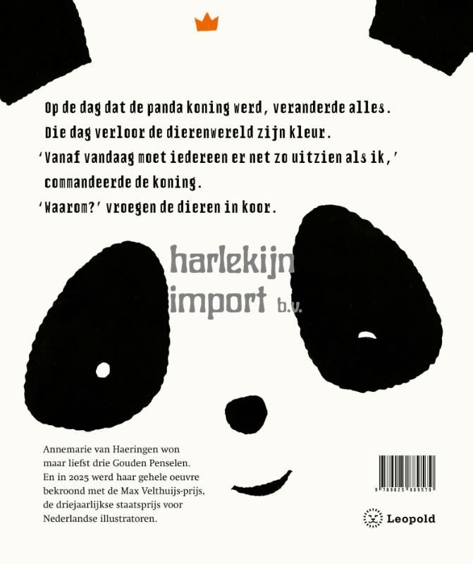 In het prentenboek De kleur van de panda van Max Velthuijs-winnares Annemarie van Haeringen veranderde alles op de dag dat de panda koning werd. ‘Vanaf vandaag moet iedereen er net zo uitzien als ik,’ commandeerde hij. ‘Waarom?’ vroegen de dieren. Maar ze trokken allemaal een zwart-wit pandakostuum aan en de koning droeg hun kleed, liefst zo bont en kleurig mogelijk. Tot hij de mandril-outfit probeerde. En het pak van de naaktslak: ‘Zo bloot, je ziet alles!’ Beschaamd kroop hij terug in zijn eigen vlekken. En de dieren haalden opgelucht adem, ze konden weer zijn wie ze waren.