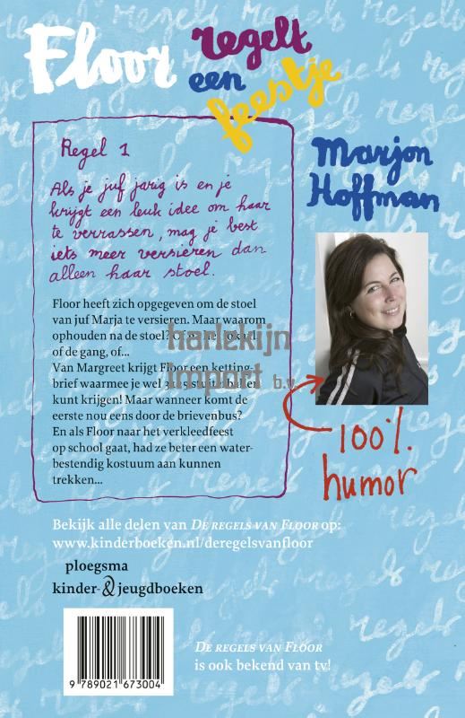 Regel 1: Als je juf jarig is en je krijgt een leuk idee om haar te verrassen, mag je best iets meer versieren dan alleen haar stoel. Floor heeft zich opgegeven om de stoel van haar jarige juf te versieren. Maar waarom ophouden na de stoel? Of na het lokaal, of de gang, of Van Margreet krijgt Floor een kettingbrief waarmee je wel 3125 stuiterballen kunt krijgen! Maar wanneer komt de eerste nou eens door de brievenbus? En als Floor naar het verkleedfeest op school gaat, had ze beter een waterbestendig kostuum aan kunnen trekken.