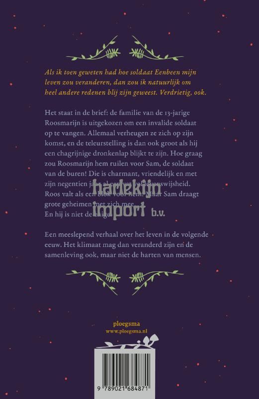 Soldaten die gewond terugkeren van de oorlog, worden ondergebracht bij boerenfamilies. Bij de 13-jarige Roosmarijn is de teleurstelling groot als de mopperende Memet bij hen in huis komt. Hoe graag zou zij hemruilen voor de soldaat van de buren! Deze Sam, om voor de hand liggende redenen Eenbeen genoemd, isinnemend, vriendelijk en een vat vol levenswijsheid, en Roos valt als een blok voor hem. Maar Eenbeen draagt grote geheimen met zich mee…De setting van het verhaal is een wereld waarin klimaatrampen tot een nieuwe orde hebben geleid. Toch leest het verhaal lichtvoetig, bijna hoopvol. Roosmarijn is een heerlijk personage dat je meeneemt in al haar gedachten en gevoelens, en dat zijn er nogal wat!