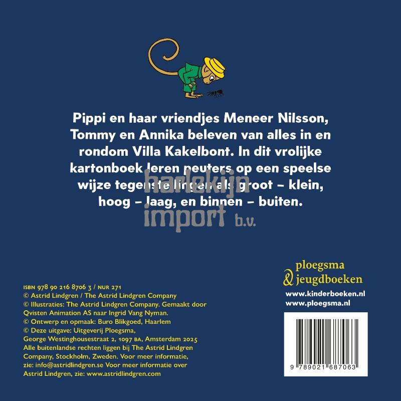 Een vrolijk kartonboek over Pippi Langkous, waarin kleintjes kennismaken met zeven tegenstellingen, waaronder groot en klein én alleen en samen. Pippi en haar vriendjes Meneer Nilsson, Tommy en Annika beleven van alles in en rondom Villa Kakelbont. Er wordt gepicknickt, Meneer Nilsson klautert in een boom en Pippi laat weer eens zien dat ze de allersterkste is! In dit kleurrijke en stevige kartonboek met afgeronde hoekjes maken peuters op een leuke manier kennis met tegenstellingen als dag en nacht, binnen en buiten, en hoog en laag.