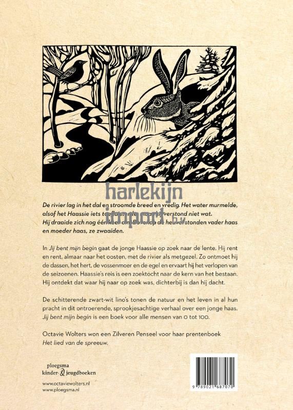 In Jij bent mijn begin van Octavie Wolters gaat de jonge Haassie op zoek naar de lente. Hij rent en rent, almaar naar het oosten, met de rivier als metgezel. Zo ontmoet hij de dassen, het hert, de vossenmoer en de egel en ervaart hij het verlopen van de seizoenen. Haassie’s reis vertelt over een jonge haas die de wereld zoekt en zijn oorsprong vindt. Hij ontdekt dat waar hij naar op zoek was, dichterbij is dan hij dacht. De schitterende zwart-wit lino’s tonen de natuur en het leven in al hun pracht in dit ontroerende, sprookjesachtige verhaal over een jonge haas. Een bijzonder prentenboek voor alle mensen van 0 tot 100. Octavie Wolters haalt haar inspiratie uit de natuur. Het is het decor én onderwerp van haar schitterende boeken. Met haar boek Het lied van de spreeuw won ze de Zilveren Penseel, en ook haar boek Dit gaat nooit voorbij werd lovend ontvangen. De rivier lag in het dal en stroomde breed en vredig. Het water murmelde, alsof het Haassie iets toefluisterde, maar hij verstond niet wat. Hij draaide zich nog één keer om. Bovenop de heuvel stonden vader haas en moeder haas, ze zwaaiden.