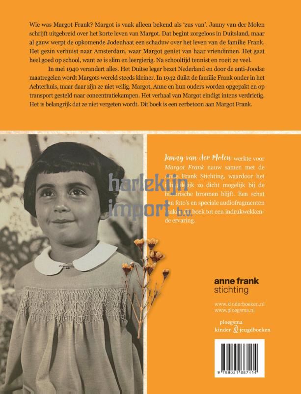 Wie was Margot Frank? Margot is vaak alleen bekend als ‘zus van’. In Margot Frank - Uit de schaduw van Anne vertelt Janny van der Molen uitgebreid over het korte leven van Margot. Haar leven begint zorgeloos in Duitsland, maar al gauw werpt de opkomende Jodenhaat een schaduw over het leven van de familie Frank. Het gezin verhuist naar Amsterdam, waar Margot geniet van haar vriendinnen. Het gaat heel goed op school, want ze is slim en leergierig. Na schooltijd tennist en roeit Margot veel. In mei 1940 verandert alles. Het Duitse leger bezet Nederland en door de anti-Joodse maatregelen wordt Margots wereld steeds kleiner. In 1942 duikt de familie Frank onder in het Achterhuis, maar daar zijn ze niet veilig. Margot, Anne en hun ouders worden opgepakt en op transport gesteld naar concentratiekampen. Het verhaal van Margot eindigt intens verdrietig. Het is belangrijk dat ze niet vergeten wordt. Dit jeugdboek is een eerbetoon aan Margot Frank. Janny van der Molen werkte nauw samen met de Anne Frank Stichting, waardoor het inhoudelijk zo dicht mogelijk bij de historische bronnen blijft. Een schat aan foto’s en speciale audiofragmenten maken dit boek tot een indrukwekkende ervaring. Eerder schreef Janny van der Molen over Anne Frank Buiten is het oorlog en Vergeet mij niet.