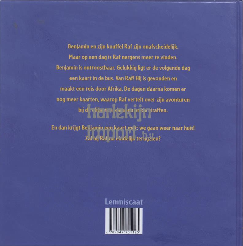 Benjamin en zijn knuffel Raf zijn onafscheidelijk. Maar op een dag is Raf nergens meer te vinden. Benjamin is ontroostbaar. Gelukkig ligt er de volgende dag een kaart in de bus. Van Raf! Hij is gevonden en maakt een reis door Afrika.