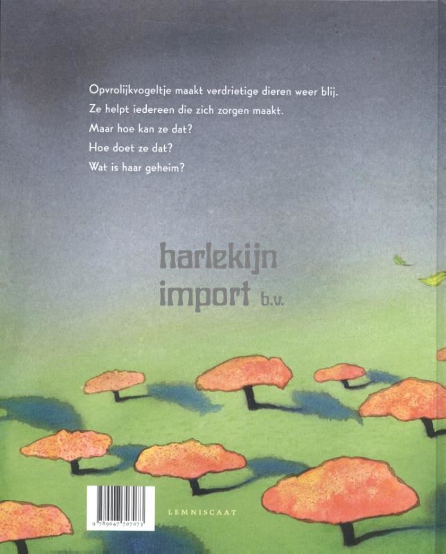 Opvrolijkvogeltje moet aan de slag. Als dit prachtige, veelkleurig vogeltje door het land vliegt, brengt ze vrolijkheid en energie aan alle dieren die ze tegenkomt - maar bij elke ontmoeting verliest ze zelf een beetje van haar kleur. Aan het eind van de dag is ze grijs en moe... totdat ze terugkeert naar haar nest, waar haar jonkies haar weer opladen met nieuwe kleur en levenskracht.