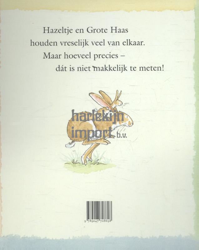Hazeltje vertelt Grote Haas hoeveel hij van hem houdt door o.a. zijn armen zo ver mogelijk te spreiden, zijn handen zo hoog mogelijk boven zijn hoofd te reiken en zo hoog mogelijk te springen. Maar natuurlijk overtreft Grote Haas hem in alles. Bewerking van de bestseller en Zilveren Griffelwinnaar, maar nu in een reuzengroot, vierkant formaat met iets dikkere pagina's. De zachtgekleurde illustraties in warme, natuurlijke tinten ademen een veilige sfeer en zijn herkenbaar voor jong en oud (ook in trek bij verliefde volwassenen). Zowel Grote Haas als Hazeltje is heel expressief in houding en gezichtsuitdrukking. De tekst is gezet in een grote letter en laat zich goed en gemakkelijk voorlezen (mede door het repeteereffect). Het verzorgd uitgegeven boek toont Grote Haas en Hazeltje die aan zijn oren trekt op de voorpagina. Een warm prentenboek, dat zeer de moeite waard is, om te lezen en te bekijken met kinderen vanaf ca. 4 jaar.