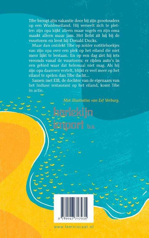 <p>Tibe brengt zijn vakantie door bij zijn grootouders op een Waddeneiland.</p><p>Hij verveelt zich te pletter. Zijn opa kijkt alleen maar vogels en zijn oma maakt alleen maar jam. Het liefst zit hij boven op de uitkijktoren en leest hij Donald Duckjes.</p><p>Maar dan ontdekt Tibe op zolder notitieboekjes van zijn opa over een plek op het eiland die niet meer lijkt te bestaan. En op een dag ziet hij iets vreemds vanaf de uitkijktoren: er rijden auto’s in een gebied waar dat helemaal niet mag. Als hij zijn opa daarover vertelt, blijkt er veel meer op het eiland te spelen dan Tibe kon vermoeden.</p><p>Samen met Elfi, de dochter van de eigenaars van het Indiase restaurant op het eiland, komt Tibe in actie.</p><p><br /></p><p>Maartje Kouwen, die we al kennen van haar natuurboeken, debuteert met een avontuurlijk jeugdboek over moed, vriendschap en opkomen voor de natuur. Je sluit Tibe en Elfi direct in je hart en zult meteen willen afreizen naar hun eiland om ook deel uit te maken van die heerlijke omgeving.</p>