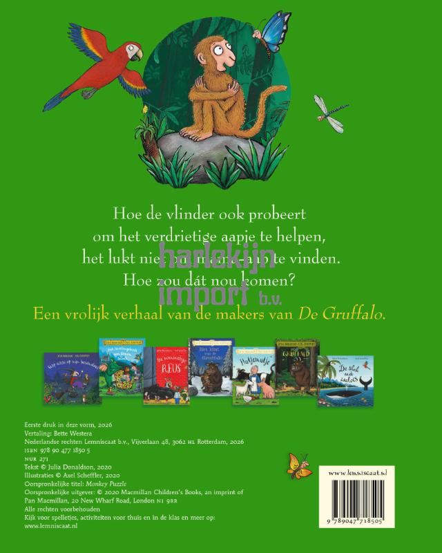 ‘Ik ben mijn mama kwijt!’‘Huil maar niet,’ zegt vlugge vlinder.‘Ik ben echt een mama-vinder.Is ze net zo groot als jij?’‘Groter,’ antwoordt aapje blij. Maar hoe de vlinder ook probeert om het verdrietige aapje te helpen, het lukt niet om mama-aap te vinden. Hoe zou dat nou komen?Julia Donaldson weet een verrassende draai aan het verhaal te geven, waardoor je denkt: O ja, natuurlijk! Een vrolijk verhaal van de makers van De Gruffalo.