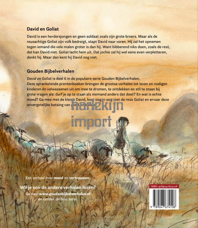 David en Goliat David is een herdersjongen en geen soldaat zoals zijn grote broers. Maar als de reusachtige Goliat zijn volk bedreigt, stapt David naar voren. Hij zal het opnemen tegen iemand die vele malen groter is dan hij. Want bibberend niks doen, zoals de rest, dat kan David niet. Goliat lacht hem uit. Dat jochie zal hij wel eens even verpletteren, denkt hij. Maar dan kent hij David nog niet. Gouden Bijbelverhalen David en Goliat is deel 6 in de populaire serie Gouden Bijbelverhalen. Deze sprankelende prentenboeken brengen de grootse verhalen tot leven en nodigen kinderen én volwassenen uit om mee te dromen, te ontdekken en stil te staan bij grote vragen als: durf je op te staan als niemand anders dat doet? En wat is echte moed? Ga mee met de kleine David, kom oog in oog met de reus Goliat en ervaar deze onvergetelijke botsing van goed en kwaad.