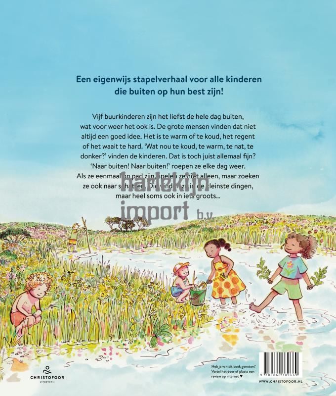 Een eigenwijs prentenboek voor alle kinderen die buiten op hun best zijn. Vijf buurkinderen zijn het liefst de hele dag buiten, wat voor weer het ook is. De grote mensen vinden dat niet altijd een goed idee. Het is te warm of te koud, het regent of het waait te hard. ‘Wat nou te koud, te warm, te nat, te donker?’ vinden de kinderen. Dat is toch juist allemaal fijn? ‘Naar buiten! Naar buiten!’ roepen ze elke dag weer. Als ze eenmaal op pad zijn, spelen ze niet alleen, maar zoeken ze ook naar schatten. Die vinden ze in de kleinste dingen, maar heel soms ook in iets groots…