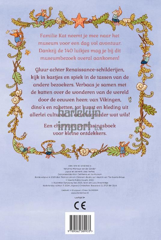 Familie Kat neemt je mee naar het museum voor een dag vol avontuur. Dankzij de 140 luikjes mag je bij dit museumbezoek overal aankomen! Gluur achter Renaissance-schilderijen, kijk in kastjes en spiek in de tassen van de andere bezoekers. Verbaas je samen met de katten over de wonderen van de wereld door de eeuwen heen: van Vikingen, dino’s en raketten, tot kunst en kleding uit allerlei culturen, – er is voor ieder wat wils! Een charmant verrassingsboek voor kleine ontdekkers.