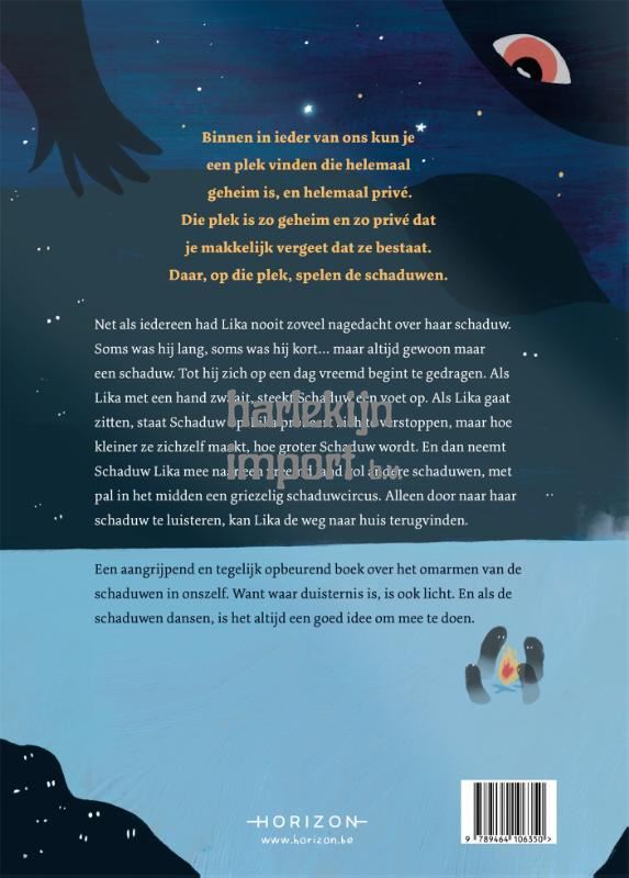 Lika heeft nooit veel aandacht besteed aan haar schaduw. Soms is hij lang, soms is hij kort. Maar hij is er altijd. Tot de dag dat hij zich vreemd begint te gedragen. Als Lika met haar hand zwaait, steekt Schaduw een voet op. Als Lika gaat zitten, staat Schaduw op. Lika probeert zich te verstoppen, maar hoe kleiner ze zichzelf maakt, hoe groter Schaduw wordt. Dan neemt Schaduw Lika mee naar een vreemd land met een griezelig schaduwcircus. Alleen door naar haar schaduw te luisteren, kan Lika de weg naar huis terugvinden.